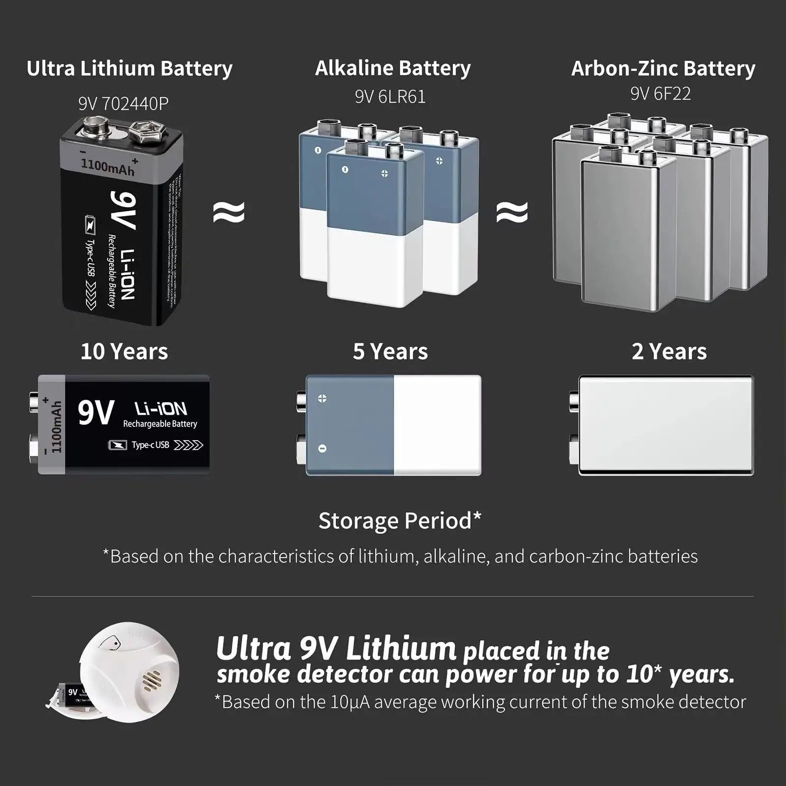 Ultra Long Lasting: Kuugro 9V batteries 1100mWh use high-quality li-ion cells with high energy density that store more energy and last longer.